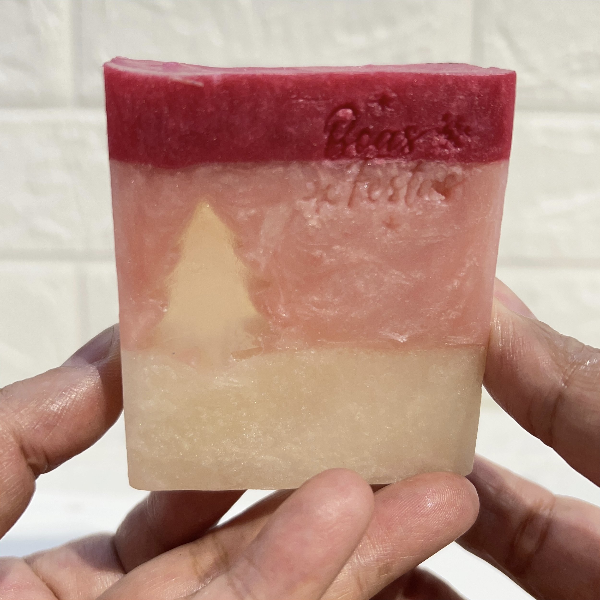 Meu Mundo Rosa de Natal traz a delicadeza das festas envolta em tons rosados, com uma árvore suave encaixada no centro — como se fosse um pequeno cenário natalino preservado dentro do sabonete.